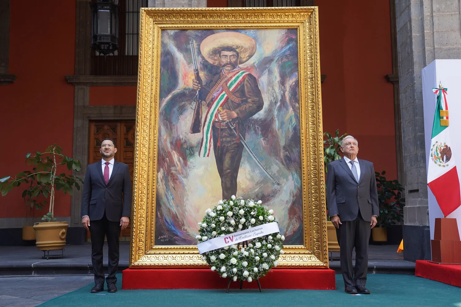 El presidente Andrés Manuel López Obrador conmemoró en el Patio de Honor de Palacio Nacional el 105 aniversario luctuoso de Emiliano Zapata, dirigente campesino y defensor auténtico de los derechos del pueblo durante la Revolución Mexicana.