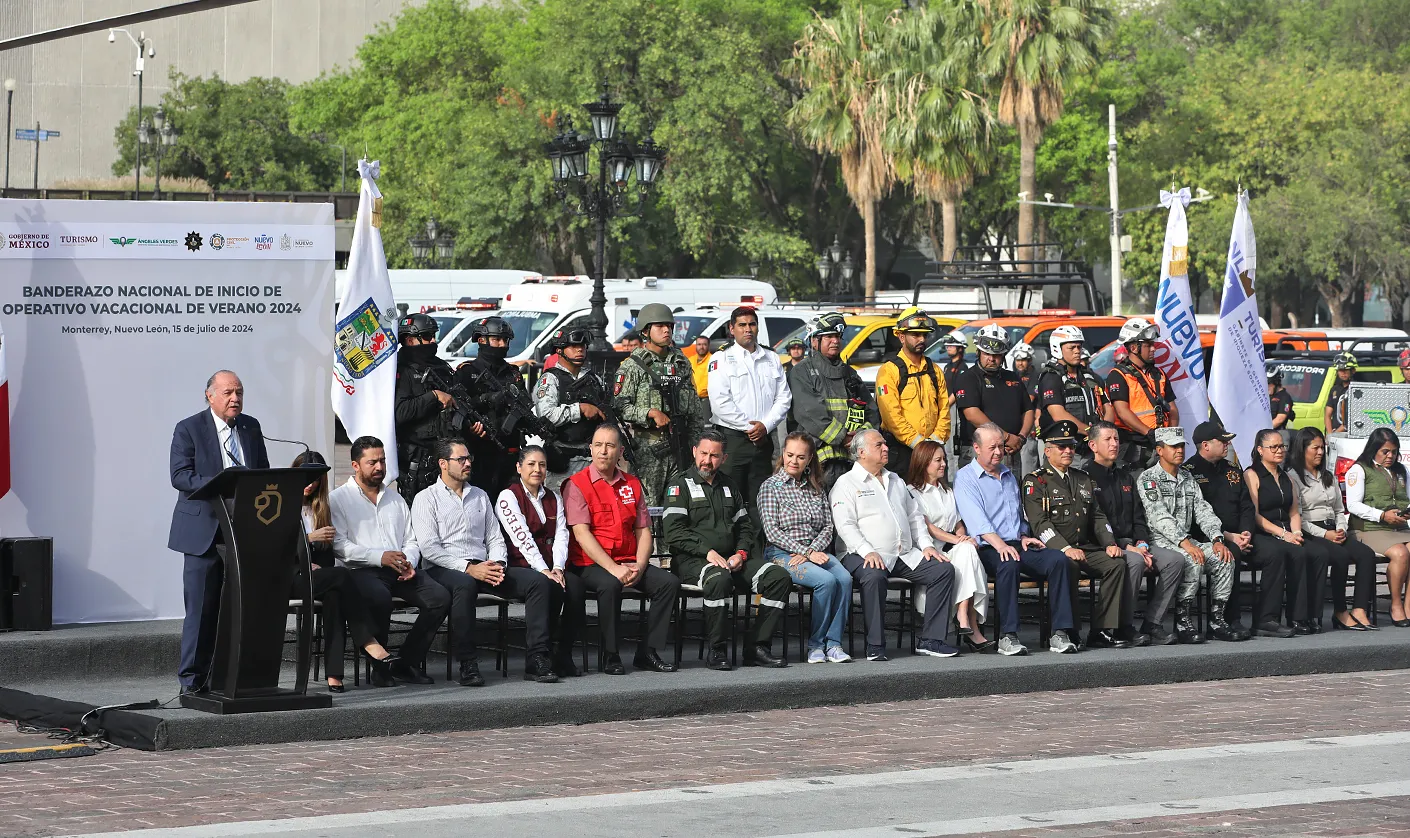 El secretario de Turismo del Gobierno de México, Miguel Torruco Marqués y el secretario general de Gobierno de Nuevo León, Javier Navarro Velasco, en representación del gobernador, Samuel García Sepúlveda, encabezaron el banderazo nacional del Operativo Vacacional de Verano 2024, en Monterrey.