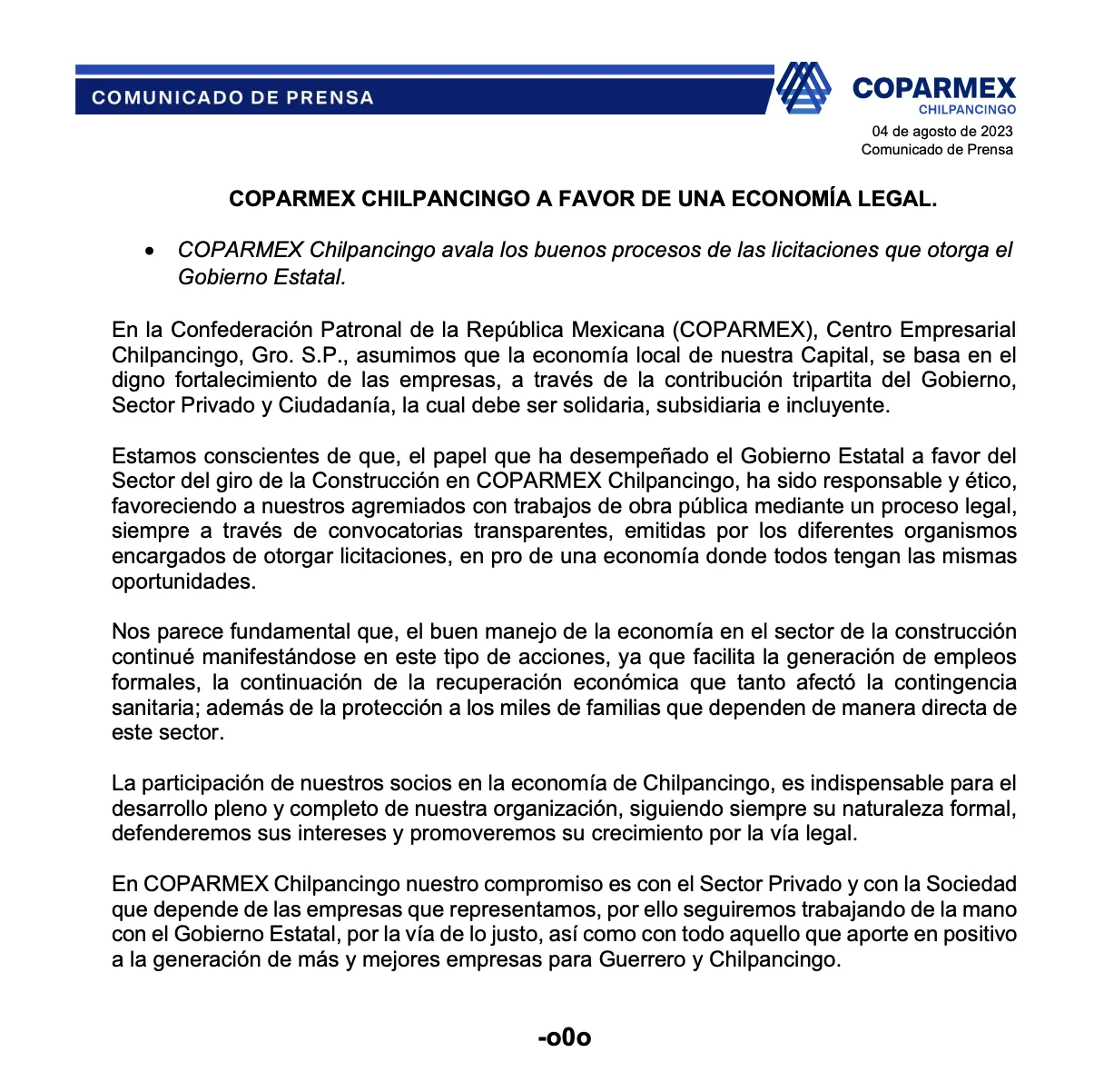 A través de una declaración oficial, Confederación Patronal de la República Mexicana (COPARMEX), Centro Empresarial Chilpancingo expresa su gratitud por las acciones tomadas en el estado, resaltando la importancia de fortalecer a las compañías locales.