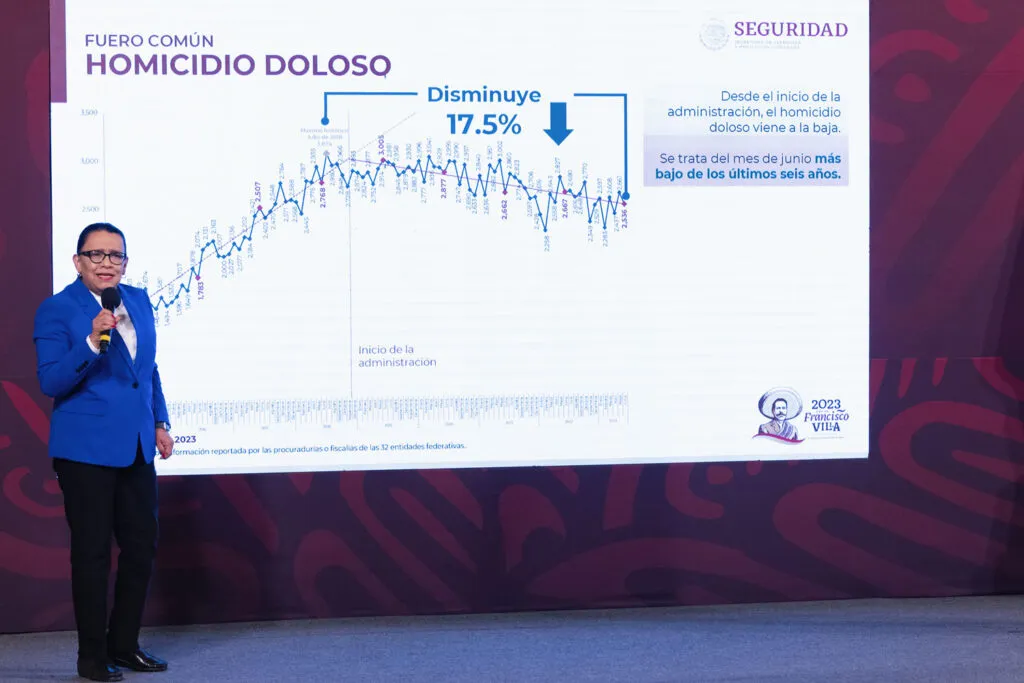 Desde el inicio del Gobierno de la Cuarta Transformación, el delito de homicidio doloso en México se mantiene a la baja. El mes pasado, fue el junio con menos casos en los últimos seis años y, respecto al máximo histórico de 2018, disminuyó 17.5 por ciento, informó la secretaria de Seguridad y Protección Ciudadana, Rosa Icela Rodríguez Velázquez.