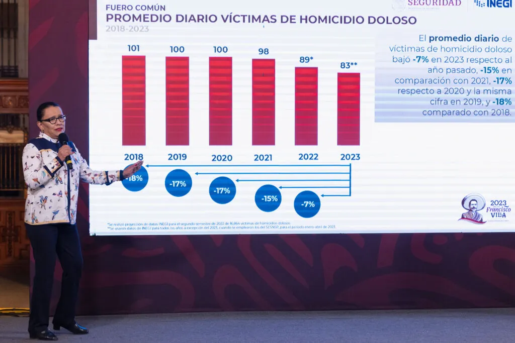 En conferencia de prensa matutina con el presidente Andrés Manuel López Obrador expuso que se registraron 16.1 por ciento menos víctimas de homicidios dolosos respecto al máximo histórico de 2018.