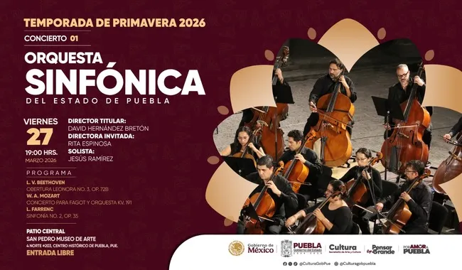 La Orquesta Sinfónica del Estado de Puebla (OSEP) iniciará la Temporada de Primavera 2026, y contará con la participación de directores nacionales e internacionales, solistas y obras del repertorio sinfónico universal, durante los viernes de marzo a junio, en San Pedro Museo de Arte.