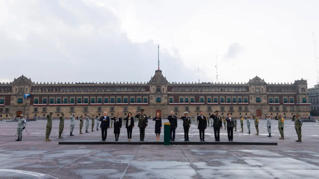 Alrededor de las 7:15 horas, tiempo del centro, el mandatario salió de Palacio Nacional hacia el Zócalo de la Ciudad de México para participar en la ceremonia solemne junto a la presidenta electa Claudia Sheinbaum Pardo; las secretarias de Gobernación, Luisa María Alcalde Luján y de Seguridad y Protección Ciudadana, Rosa Icela Rodríguez Velázquez; los secretarios de la Defensa Nacional, Luis Cresencio Sandoval González y de Marina, José Rafael Ojeda Durán; la coordinadora nacional de Protección Civil, Laura Velázquez Alzúa; el comandante de la Guardia Nacional, David Córdova Campos; el jefe de gobierno de la Ciudad de México, Martí Batres Guadarrama y el presidente nacional de la Cruz Roja Mexicana, Carlos Freaner Figueroa.