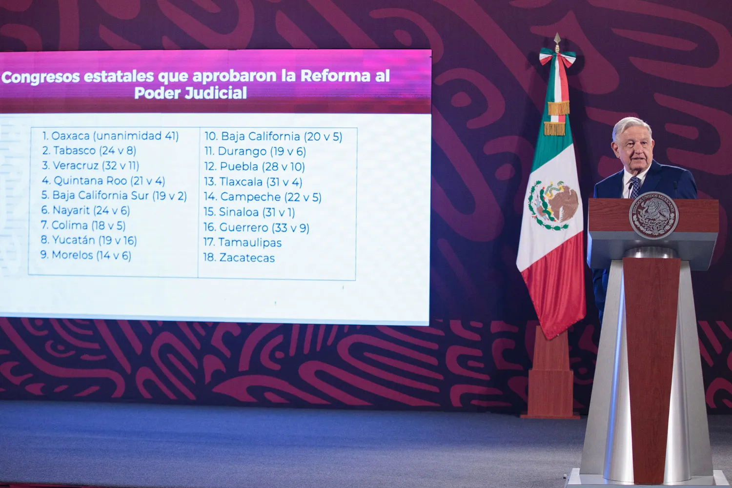 En conferencia de prensa matutina el mandatario explicó que cualquier reforma a la Constitución requiere la aprobación en al menos 17 congresos estatales, de modo que la propuesta del Ejecutivo al Poder Judicial ya es legal al cumplir con todo el procedimiento legislativo.