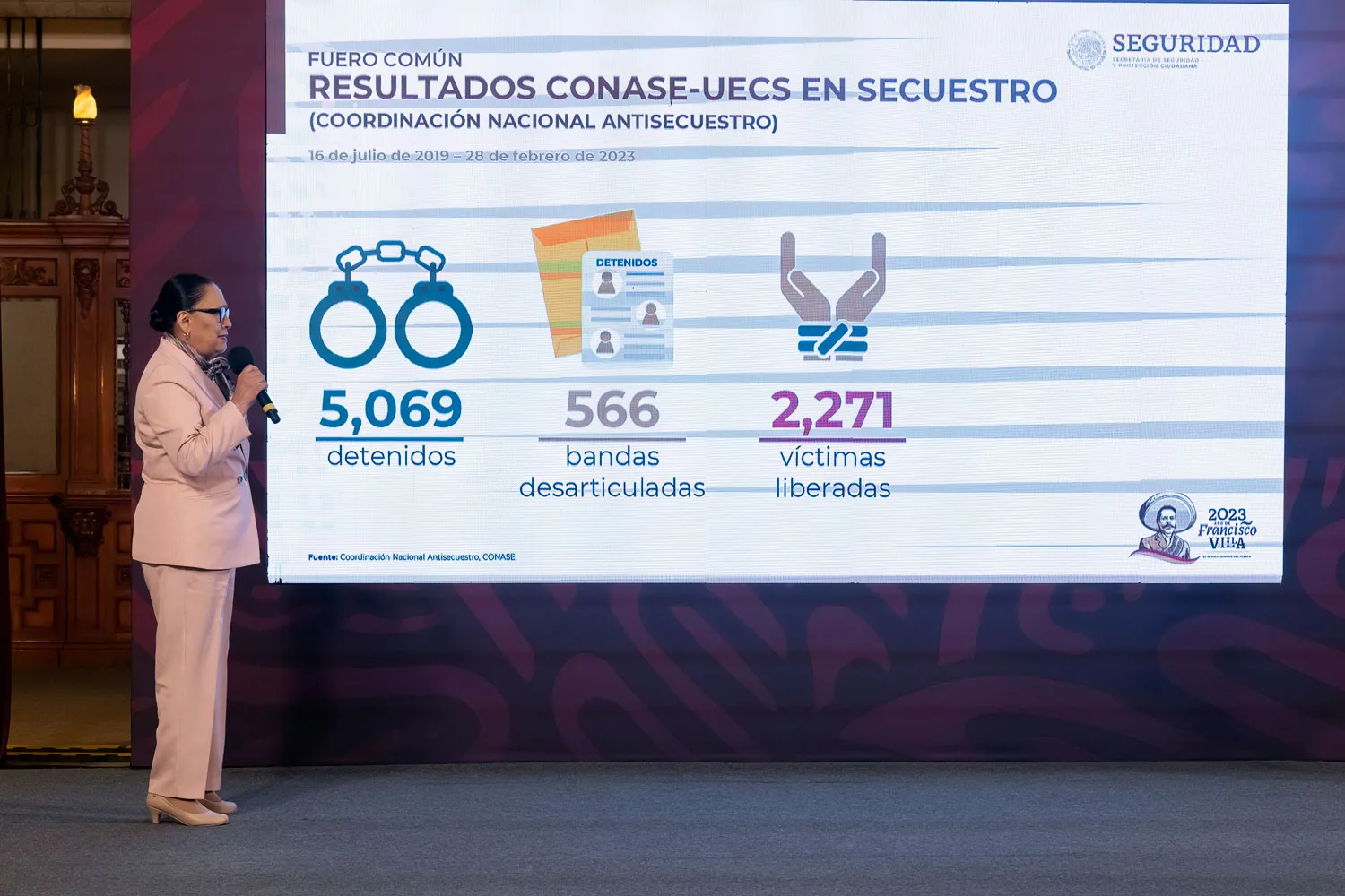 El delito de secuestro disminuyó 65.4 por ciento en relación con enero de 2019, al pasar de 185 a 64 hechos; se trata del mes de febrero más bajo desde que se tiene registro. Por este ilícito, hay 5 mil 69 detenidos, 566 bandas desarticuladas y dos mil 271 víctimas liberadas tras las labores de la Coordinación Nacional Antisecuestro.