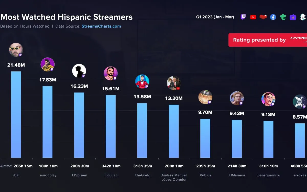 El canal del presidente de México, Andrés Manuel López Obrador, es el sexto más famoso en habla hispana, según Stream Charts. El anuncio oficial dado en el reporte del primer trimestre del 2023 tomó por sorpresa a streamers y el propio Ibai respondió a Stream Charts cuestionando sobre la decisión de incluir al presidente en el listado.