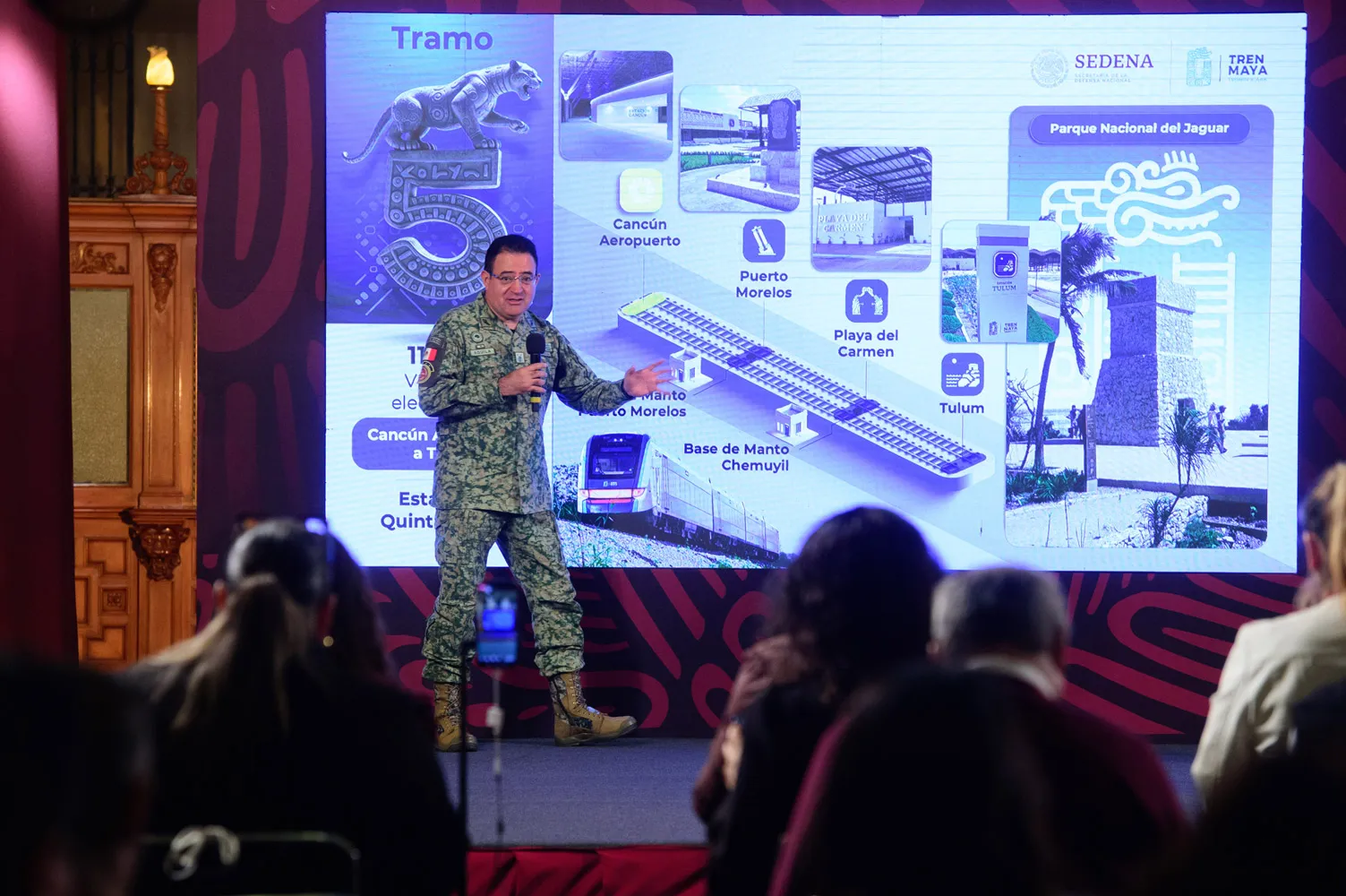 La Secretaría de la Defensa Nacional (Sedena), a través del agrupamiento de ingenieros Felipe Ángeles, entregó en el tramo 5 norte 43.3 kilómetros de vía férrea en viaducto y terraplén, el paso superior ferroviario Leona Vicario, 17 pasos de fauna, seis pasos vehiculares y la estación Puerto Morelos, informó el jefe del Centro Coordinador de Operaciones del Tren Maya, Blas Andrés Núñez Jordán.