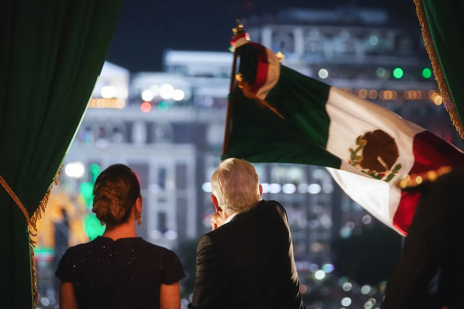 Luego del acto protocolario por la conmemoración del 214 Aniversario del Grito de Independencia, el jefe del Ejecutivo apreció junto a la doctora Beatriz Gutiérrez Müller luminarias con drones que formaron la palabra “¡Gracias!”.